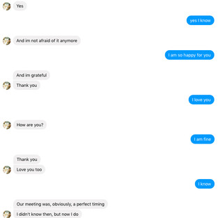 - Ce 16 novembre au moment où j'écris cet article, je lui envoie un lien vers la description du chemin de vie 11, parce que je pense à lui et il me répond et on s'échange notre gratitude réciproque. Je lui avoue que je n'étais pas seule quand je l'ai rencontré. Je lui parle de mon jumeau et il se confie lui aussi sur sa relation de "cosmic twins". On se souhaite de beaux rêves et je comprends qu'il m'écrit depuis le dortoir des enfants dans l'institut où il travaille de nuit.